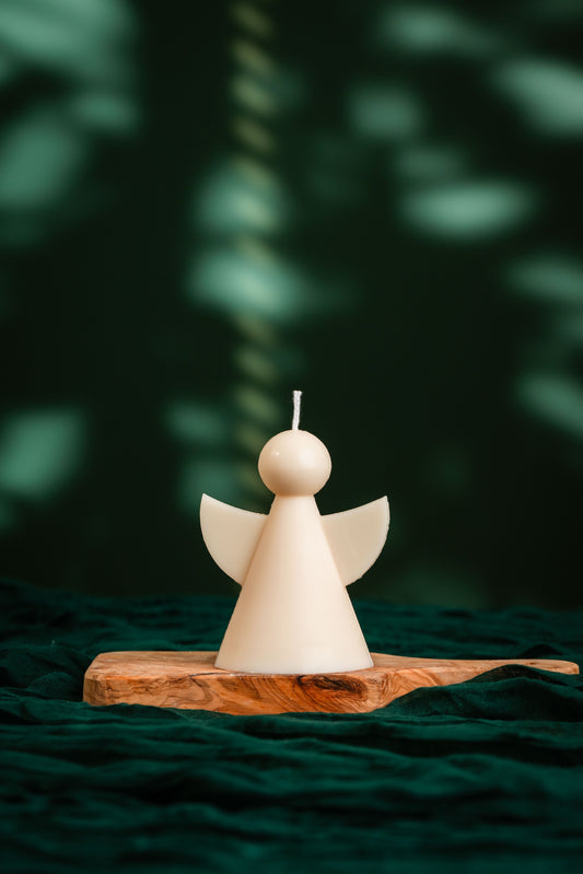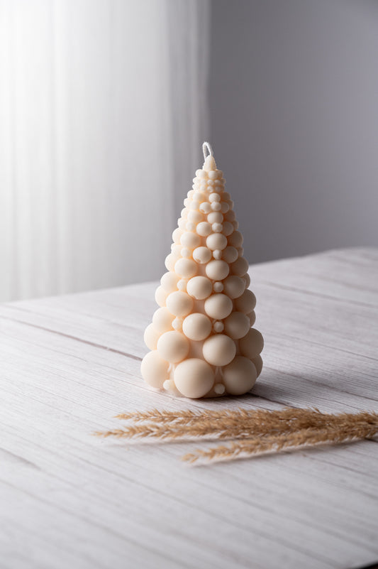 • A white 3D Christmas tree-shaped candle, along with colorful Christmas ornaments, on a wooden surface.