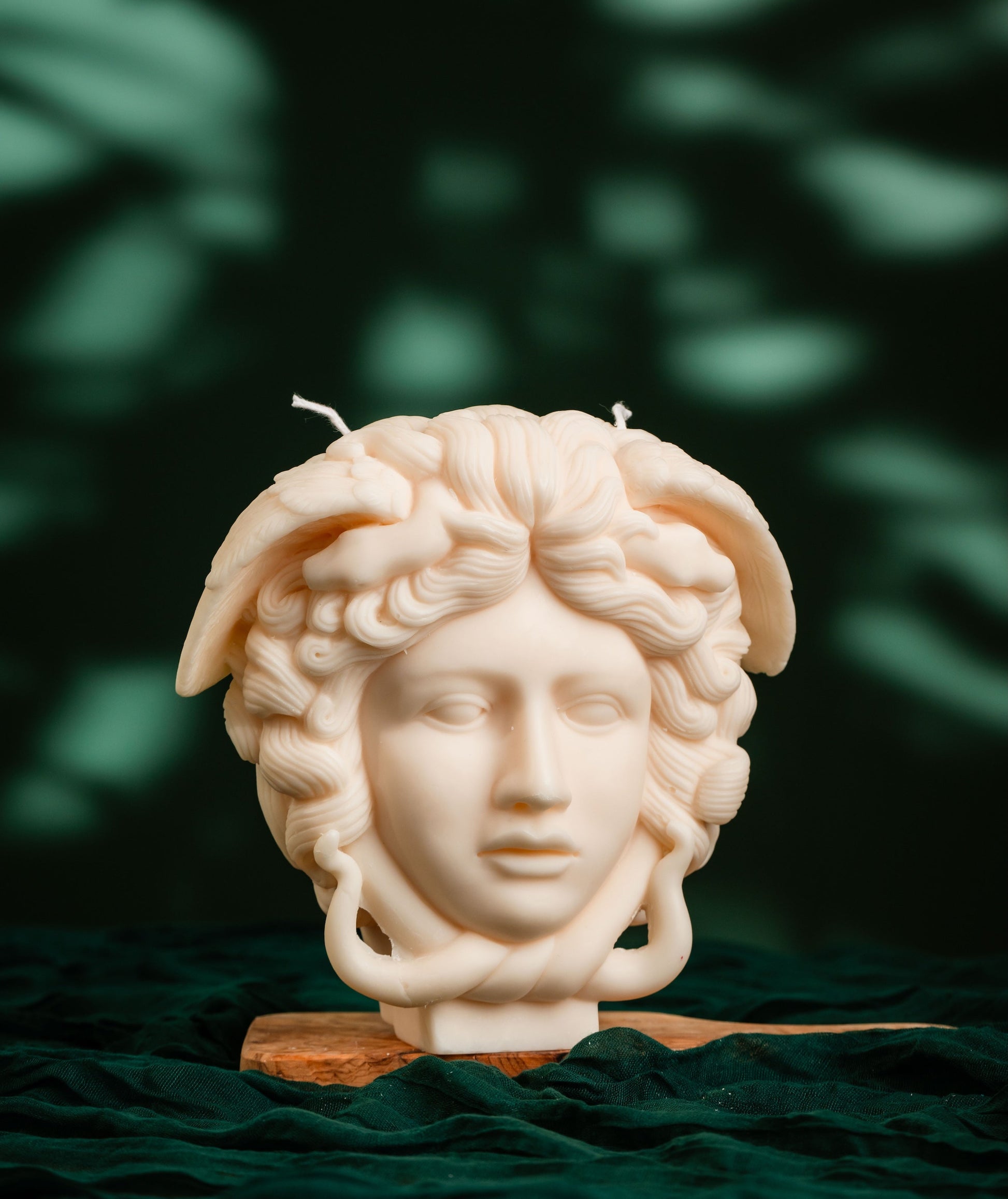 Each Medusa sculpture candle is individually hand-poured, so slight variations in color or texture may occur. A natural frosted finish is a common trait of soy wax and highlights its authenticity. To refresh the surface, gently polish with a soft cloth and a touch of unscented oil.