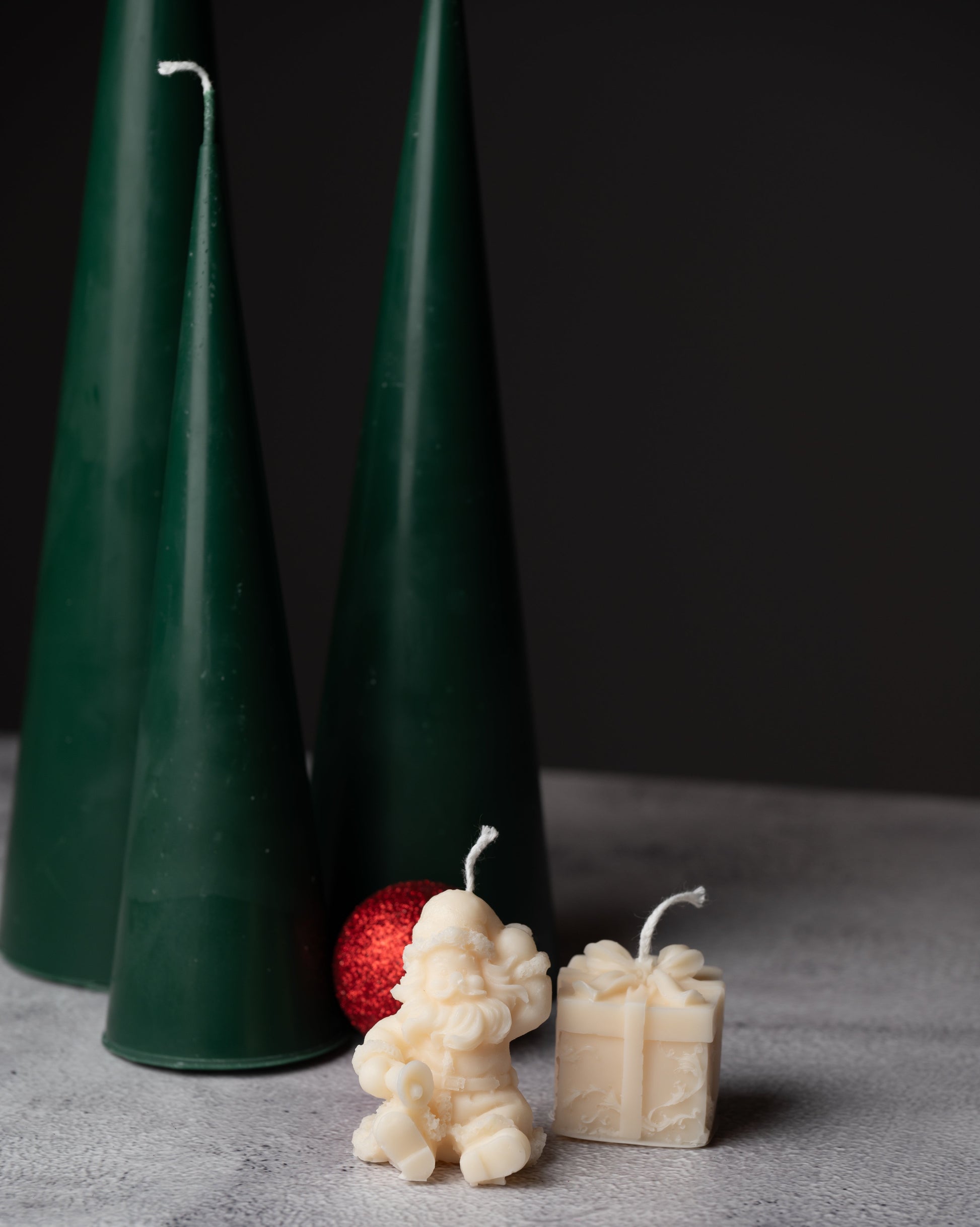 Each Santa candle is carefully hand-poured, resulting in subtle variations in finish that enhance its artisanal appeal. Natural frosting may appear on soy wax over time, reflecting its authenticity. To restore surface smoothness, gently wipe with a soft cloth and a drop of unscented vegan oil.